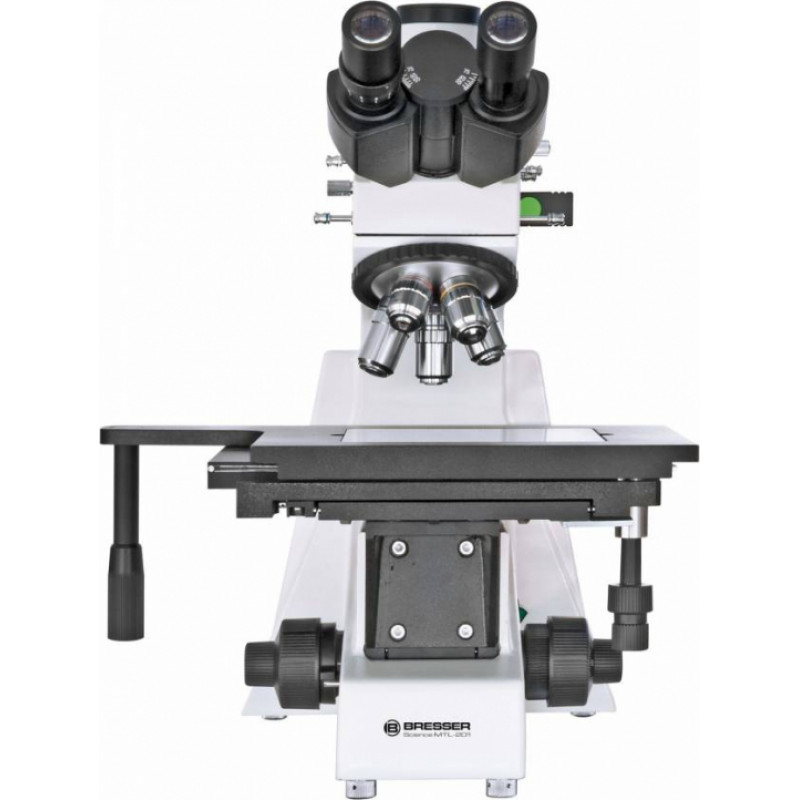 BRESSER Science MTL 201 50-800x MicroscopeThe BRESSER Science MTL 201 is a special reflected light microscope, which allows to observe non-transparent surfaces at higher magnifications (50x-800x). This solid designed instrument is ideal for working in metallography (e. g. microscopy of polished samples of metals or alloys), mineralogy, precision engineering and electronics. It is suitable for scientific research, teaching demonstration and industrial production (e.g. quality controlling). According to its purposes, the MTL 201 is equipped with a large stage (250 mm x 230 mm), which can be moved coarsely by a quick adjustment lever and finely by a transverse and a longitudinal knob. The focuser has coarse and fine drive (coaxial; circa 70 µm/ full turn). The illumination is done by a halogen lamp (20 W) with a dimmer. The light comes through the objective from above onto the sample. There are a field diaphragm, which can be centered, some filters (yellow, green, blue, ground glass) and a polarizer/analyzer combination. The fivefold nosepiece is equipped with planachromatic DIN objectives (5x, 10x, 20x, 40x, 80x). The trinocular head bears two 30° inclined ocular tubes and the photo tube. The oculars (with 10x wide field lenses) have diopter and eye relief adjustments. The photo tube allows for digital imaging, e. g. with an optional available PC eyepiece. Further optional accessories: Eyepiece (WF16x), dividing eyepiece (WF10x), planachromatic objective (50x).