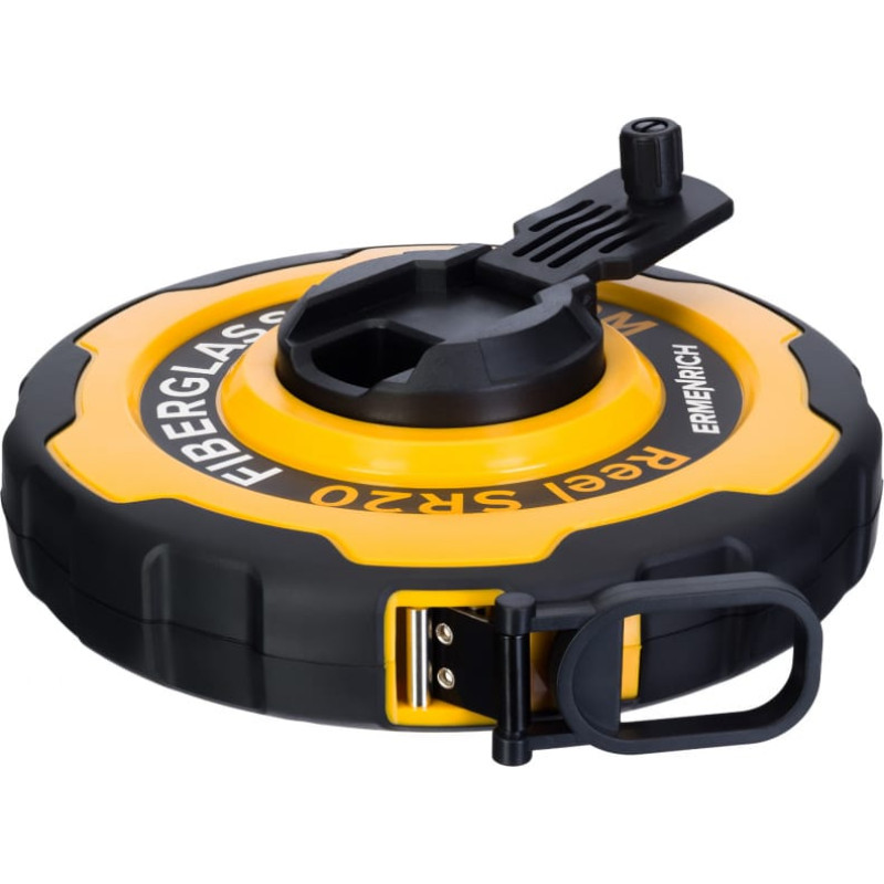 The Ermenrich Reel SR20 Ruler Tape is a 20-meter fiberglass tape measure in a sealed disk-type case made of high-strength ABS plastic. The tape can be used to take measurements during repair, decoration, or construction works, when cutting elongated materials, zoning a plot of land, and in many other situations. Rugged, durable, easy-to-use, and user-friendly, the Ermenrich Reel SR20 Ruler Tape comes in handy for both professional and home use. The tape measure has a large end hook and a dual scale. The fiberglass tape does not break, it easily restores its original shape, and it is moisture-resistant. Therefore, the tape measure can be used in any weather and in any conditions. A reel handle is used to roll up the tape. When you don't need it, it can easily be folded back. The rolling mechanism is strong and lasts a long time. There is an ergonomic thermoplastic rubber grip cover (TPR) on the upper part of the case. Key features: