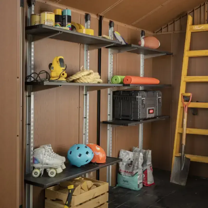 Настройте свой сарай с помощью нашего нового комплекта полок 100. С почти трехметровым прочным, гибким настенным хранилищем вы можете организовать свои вещи для легкого доступа, избавляя вас от необходимости искать их в кучах на полу. Включает три сверхдлинные полки по 97 см каждая. Комплект полок 100 гарантированно подойдет для любого сарая Keter (кроме нашей линейки Factor). Вы можете определить высоту между полками в соответствии с вашими потребностями.