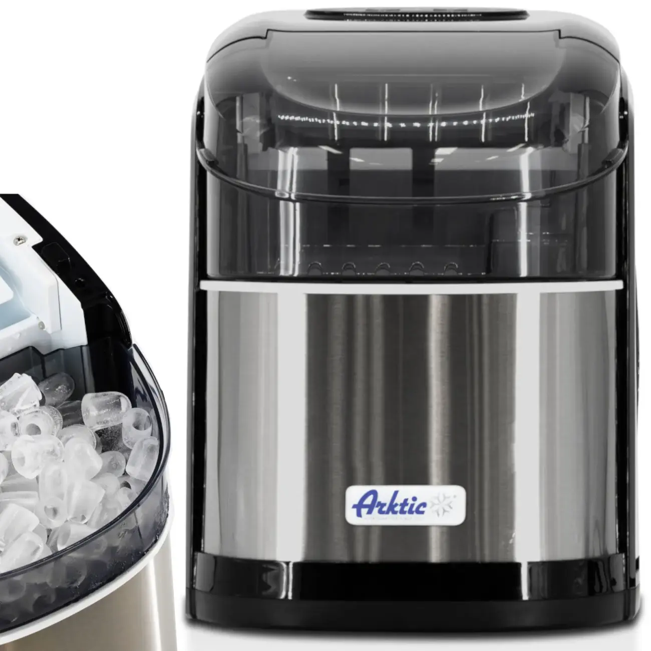 Kostkarka do lodu firmy Arktic produkuje do 12 kg lodu dziennie i nie wymaga podłączenia do wody. To sprawia, że łatwo ją przenosić i ustawić w dowolnym miejscu, na przykład na blacie, do codziennego użytku. Wskaźniki w kostkarce ostrzegają o niskim poziomie wody oraz maksymalnym poziomie wypełnienia pojemnika lodem. Szufelka do lodu dołączona do zestawu ułatwia korzystanie z urządzenia. Kostkarka wykonana została ze stali nierdzewnej i ABS.