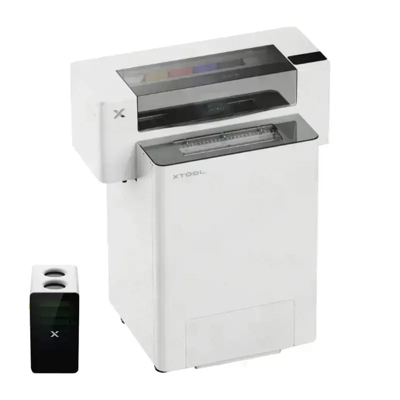 The xTool Apparel Printer is an advanced apparel printer designed for professional use in the textile and advertising industry. It can produce permanent, full-color prints on all types of fabrics - from cotton and polyester, to denim and canvas, to spandex, nylon or leather. Unlike sublimation and screen printing, it also allows printing on dark materials, guaranteeing vivid colors and sharp details. The all-in-one kit also includes equipment to support the entire printing and fixing process - the OS1 Automatic Shaker Oven Machine for automatic application and fixing of adhesive powder, and the SafetyPro™ AP2 Air Purifier, an air purifier for removing dust and odors when working with laser and thermal equipment.