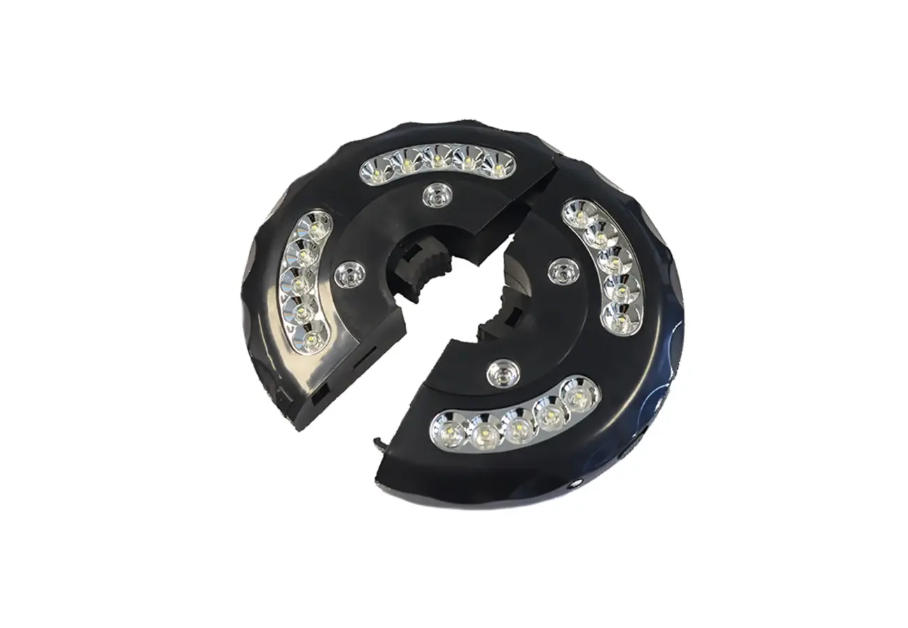 The Tent Pole Light is a compact, practical solution for lighting your canvas tent. Designed with a donut-shaped body and spring-loaded clamps, it clips securely around poles ranging from 2.5 cm (1 in) to 4 cm (1.5 in) in diameter — perfect for Sibley Bell Tents, umbrellas, or sunshades.
