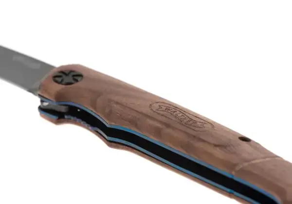 Taktikaline nuga sinise viimistluse ja puidust käepidemega. Tera pikkus: 95 mm, käepideme pikkus: 122 mm.