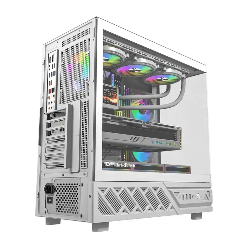 DarkFlash DS950 is an ATX computer case that allows you to build a powerful configuration for gaming and more. The design offers a 270° panoramic view, making the interior of the computer fully visible from two sides – so you can showcase selected components in an interesting way, such as those with RGB lighting. You also have a rich set of ports at your disposal, including USB-C 3.2 Gen 2. The case supports ATX, Micro-ATX, and ITX motherboards and measures 450 × 222 × 465 mm. It is made of 0.5 mm thick SPCC sheet metal, which provides a stable and solid base for advanced configurations. The set also includes 6 fans.