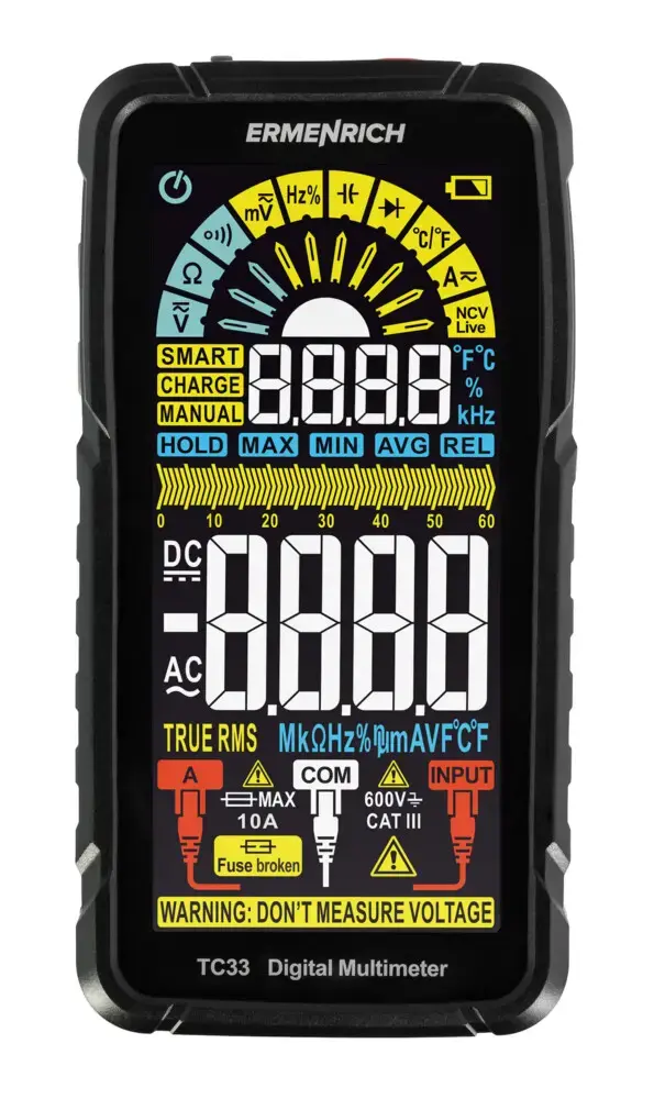 The Ermenrich Zing TC33 Digital Multimeter is a True RMS measuring device that will not take up much space in any electrician’s kit and will perfectly handle the diagnostics and maintenance of electrical networks and electrical equipment. Thanks to a wide range of functions, the multimeter is a great tool for professional tasks. It can be used by non-professionals as well, as it is equipped with smart features that make it easy to operate the device.