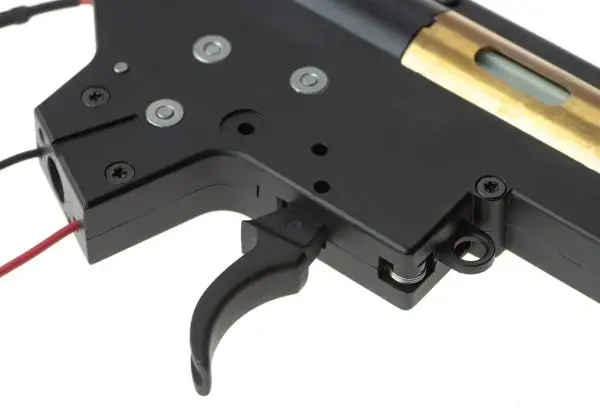 V2 gearbox made by Jing Gong for MP5 submachine . Produced from metal alloys, steel, and polymers, this complete drop-in kit with wires provides optimal out-of-the-box performance. It can be used on other platforms using a V2-type gearbox with minor changes and parts replacements.